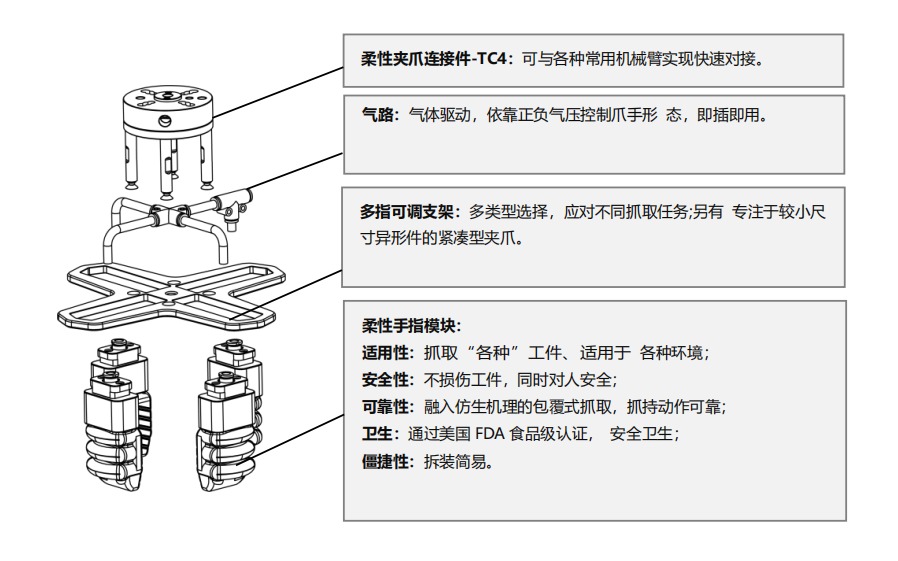 SRT's flexible gripper consists of a flexible finger module, a stand and a robot arm connection. For different shapes and sizes of workpieces, different types of finger modules can be selected, which can be reasonably matched with the suitable holder to flexibly grip and place the object.