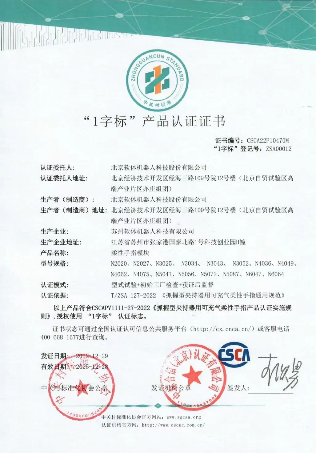 SRT積極響應國家開展標準化的步伐,依托在軟體機器人領域深耕多年的全產業(yè)鏈優(yōu)勢,既是T/ZSA 127-2022《抓握型夾持器用可充氣柔性手指通用規(guī)范》等3項中關村標準的主要起草單位,也是獲得首張中關村標準產品“1字標”認證的行業(yè)內企業(yè)。