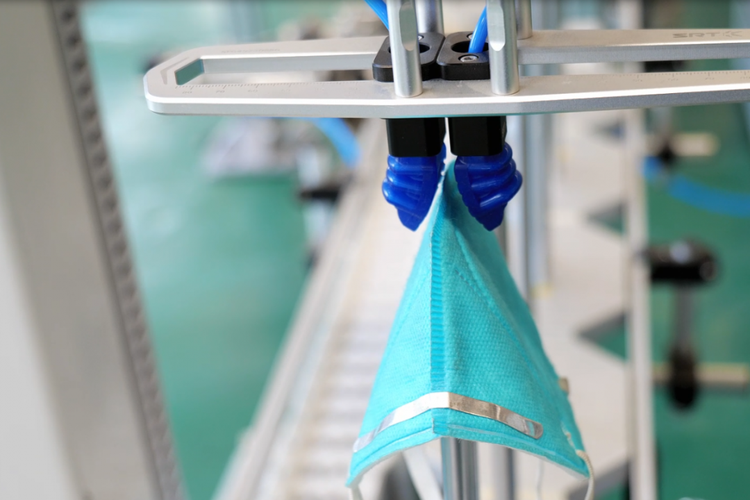 使用SRT柔性夾爪代替人手實(shí)現(xiàn)口罩的上料工作,充分保障口罩的潔凈度,避免人為污染;