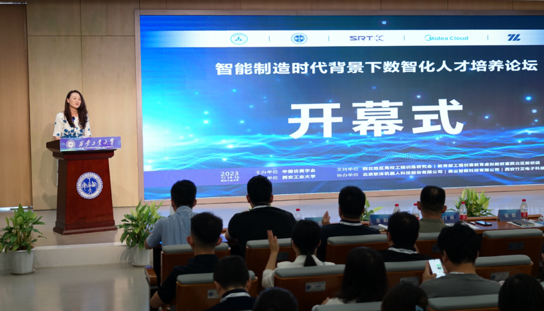 為貫徹落實(shí)黨的二十大精神和總書記關(guān)于教育的重要論述,共同探討“智改數(shù)轉(zhuǎn)”背景下的智能制造數(shù)字化人才培養(yǎng),7月14日-16日,“智能制造時(shí)代背景下數(shù)智化人才培養(yǎng)論壇”在西安工業(yè)大學(xué)隆重啟幕。中國仿真學(xué)會(huì)、西安工業(yè)大學(xué)、太原科技大學(xué)、西北工業(yè)大學(xué)、南昌大學(xué)、北京電子科技職業(yè)學(xué)院、秦皇島市職業(yè)技能公共實(shí)訓(xùn)中心的重要領(lǐng)導(dǎo),以及北京軟體機(jī)器人科技股份有限公司(SRT)等多家企業(yè)負(fù)責(zé)人出席。本次論壇由中國仿真學(xué)會(huì)主辦,西安工業(yè)大學(xué)承辦;由西北地區(qū)高校工程訓(xùn)練研究會(huì)、教育部工程創(chuàng)客教育虛擬教研室西北區(qū)教研組支持;由SRT、美云智數(shù)科技有限公司、西安竹正電子科技有限公司全程協(xié)辦,是一次具有深刻意義的年度教育盛會(huì)。數(shù)據(jù)顯示,本次論壇共吸引了來自智能制造、數(shù)字仿真領(lǐng)域?qū)<?,本科院校、高職院校智能制造專業(yè)群院系領(lǐng)導(dǎo)、專業(yè)帶頭人、工程訓(xùn)練中心負(fù)責(zé)人、相關(guān)專業(yè)骨干教師等近200人參會(huì)。