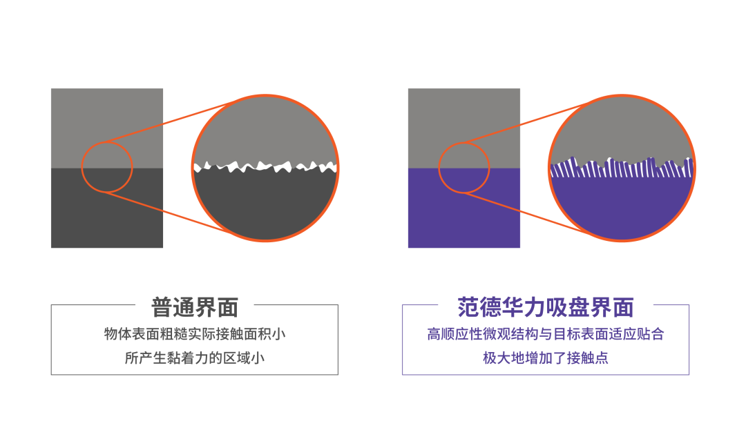 【范德華力】通過特殊的聚合物材料和微納成型工藝,增大吸盤與物體接觸面積,從而產(chǎn)生強烈的分子間作用力,即范德華力。
