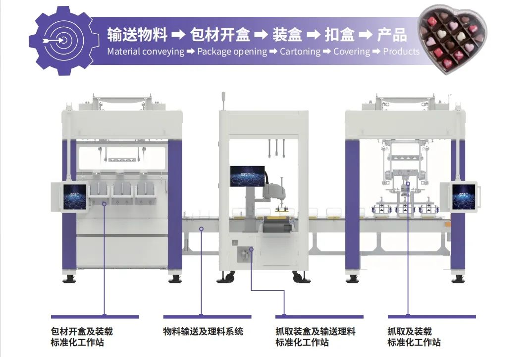 升級(jí)后的SRT移載機(jī)器人應(yīng)用平臺(tái)整體由四部分構(gòu)成,包括包材開(kāi)盒及裝載標(biāo)準(zhǔn)化工作站、物料輸送及理料系統(tǒng)、抓取裝盒及輸送理料標(biāo)準(zhǔn)化工作站、抓取及裝載標(biāo)準(zhǔn)化工作站。